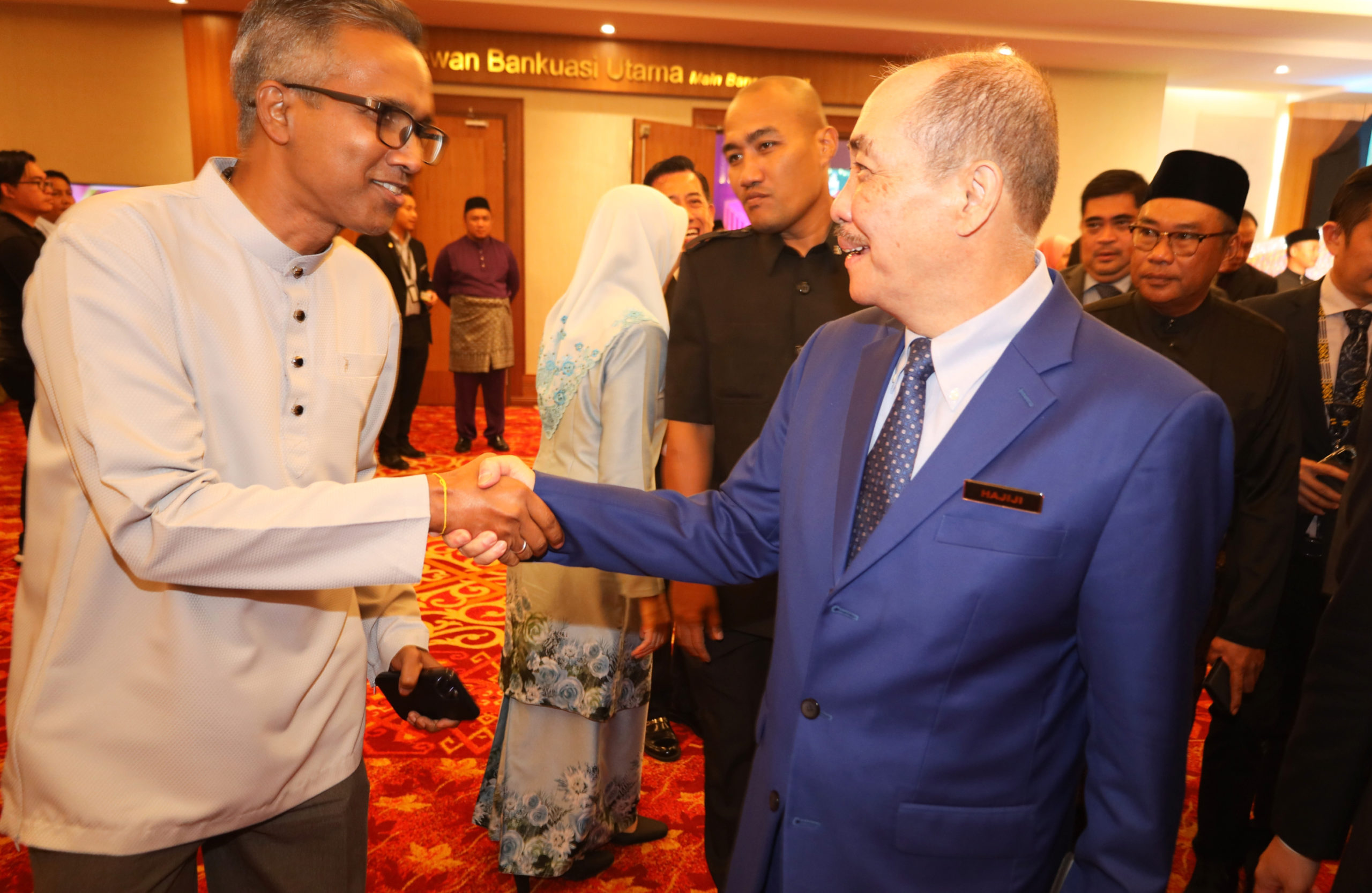 Hajiji disambut mesra para tetamu sebaik tiba di Majlis Hari Raya Aidilfitri yang dihoskan oleh Setiausaha Kerajaan Negeri Datuk Seri Sr Safar Untong di Menara Kinabalu hari ini. – Foto ihsan JKM Sabah