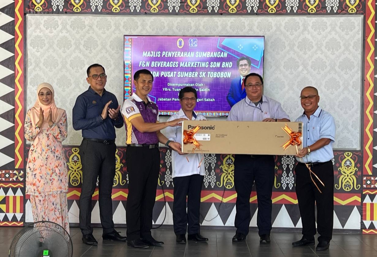 Majlis penyerahan sumbangan telah disempurnakan oleh Pengarah Jabatan Pelajaran Negeri Sabah yang baharu, Raisin Saidin dan menyaksikan Pengarah Jualan F&N Beverages Marketing Sdn Bhd, Frederick Hi menyampaikan sumbangan kepada Guru Besar Sekolah Kebangsaan Tobobon, Ag. Ghani Ag. Bakar.