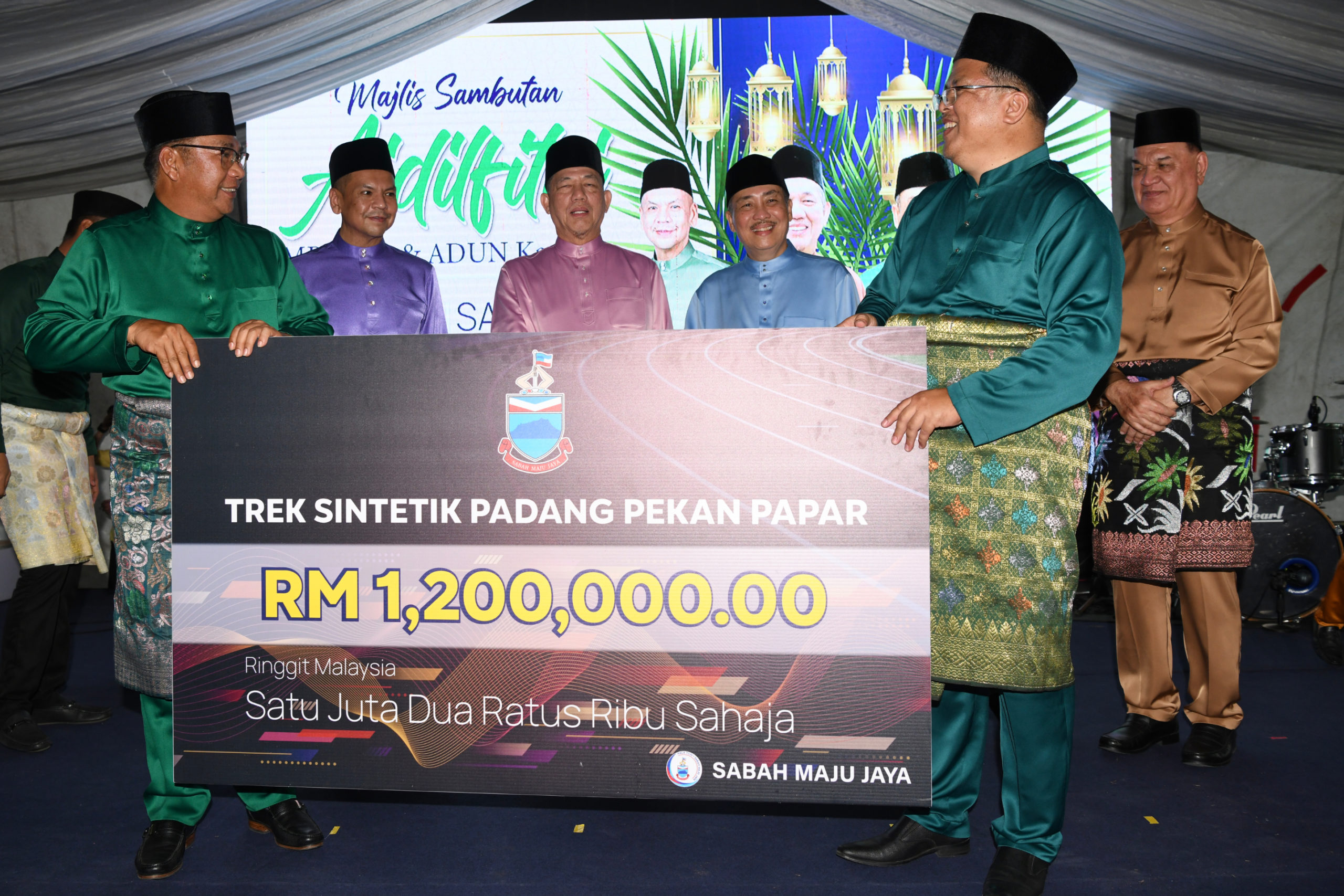 Safar turut menyampaikan cek replika berjumlah RM1.2 juta untuk pembinaan trek sintetik padang pekan Papar.