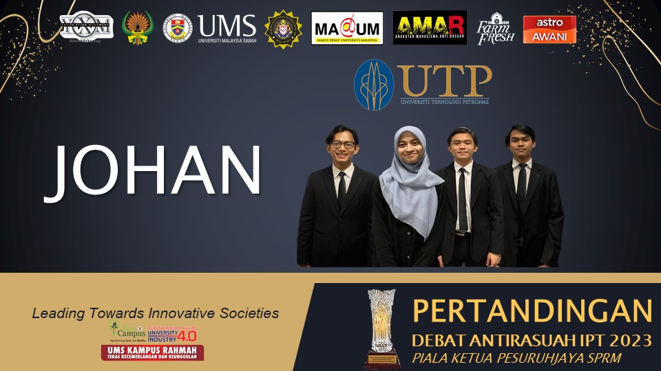 Kota Kinabalu : Pasukan debat daripada Universiti Teknologi Petronas (UTP) berjaya dinobatkan sebagai juara Pertandingan Debat Antirasuah Institut Pengajian Tinggi (IPT) Piala Ketua Pesuruhjaya Suruhanjaya Pencegahan Rasuah Malaysia (SPRM) 2023 di sini semalam.