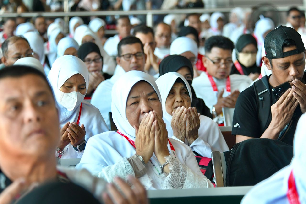 Bakal jemaah haji Sabah bagi penerbangan terakhir mengamin doa sebelum berlepas PIX MAHA