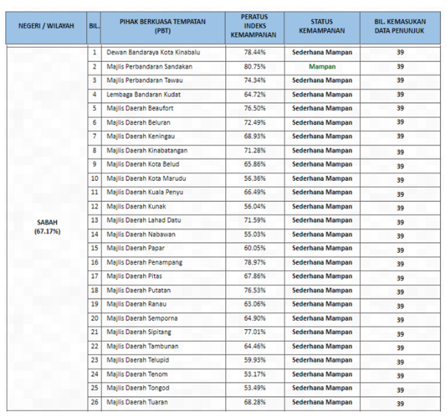 Jika melihat kepada skor di atas, keseluruhannya negeri Sabah hanya mencatat 67.17% skor berbanding negeri lain yang mencatat skor 70 dan 80 skor ke atas. Skor ini boleh dibaiki dengan usaha sama bersama antara PBT dan masyarakat. Ada juga PBT di Sabah yang mencatat skor 80 markah ke atas iaitu Majlis Perbandaran Sandakan 80.75% dan Dewan Bandaraya Kota Kinabalu dengan skor hampir 80 markah.