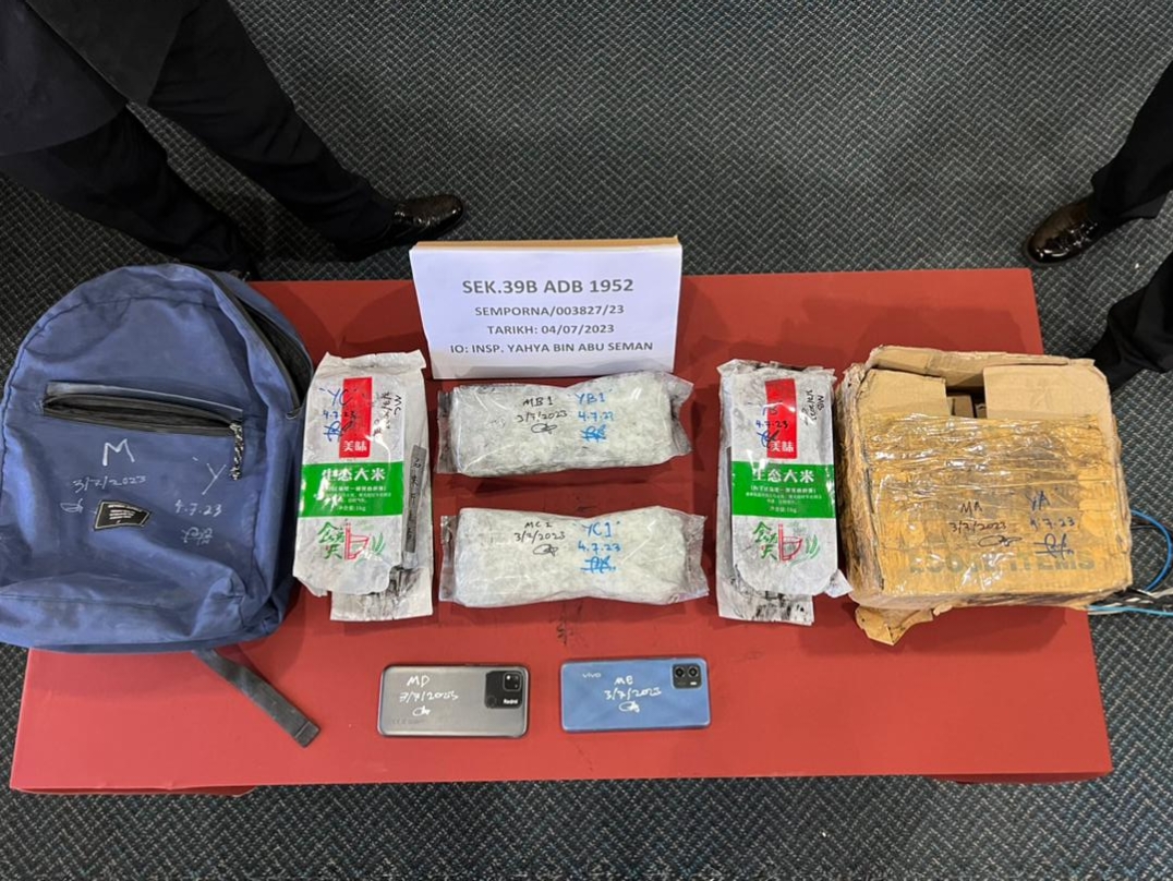 SEMPORNA: Polis berjaya menahan dua suspek lelaki bersama lebih 2 kilogram dadah jenis syabu bernilai RM72,000 dalam satu serbuan di kawasan Dataran Lepa dekat sini pada Isnin.