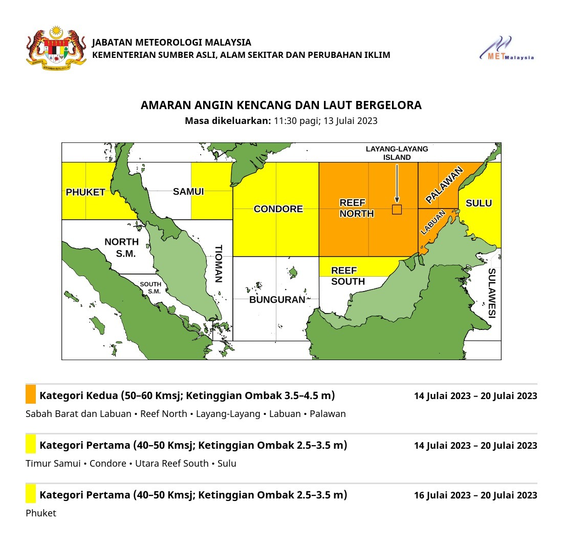 Pengarah Maritim Sabah dan Wilayah Persekutuan Labuan, Laksamana Pertama Maritim Che Engku Suhaimi Che Engku Daik berkata, amaran angin kencang dan laut bergelora serta ribut petir yang dikeluarkan Jabatan Meteorologi Malaysia (MetMalaysia) dijangka bermula 13 hingga 20 Julai ini.