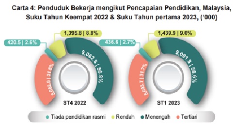 7. Menurut Laporan Survei Tenaga Buruh Suku Tahun Pertama 2023 oleh Jabatan Perangkaan Malaysia (DOSM), pencapaian pendidikan penduduk bekerja di Malaysia adalah: pendidikan menengah (56.6%, 9.09 juta orang), pendidikan tertiari (31.7%, 5.09 juta orang) dan pendidikan rendah (9.0%, 1.43 juta orang).