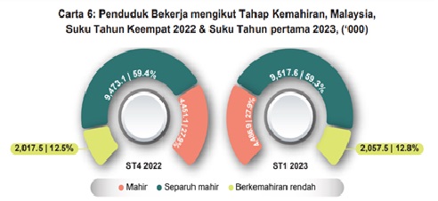 Malah, dari Suku Tahun Ke-4 2022, penduduk bekerja separuh mahir telah meningkat sebanyak 0.5% (44.4 ribu orang), dan kategori berkemahiran rendah bertambah sebanyak 2.0% (40.1 ribu orang). Pekerja mahir pula merekodkan peningkatan sebanyak 0.8% (35.8 ribu orang).