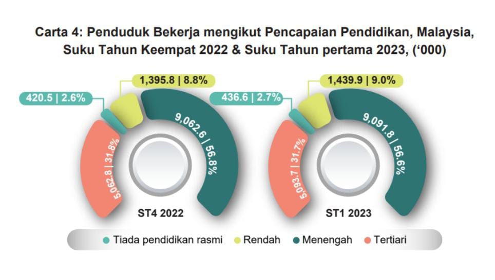 8. Menurut Laporan Survei Tenaga Buruh Suku Tahun Pertama 2023 oleh Jabatan Perangkaan Malaysia (DOSM), majoriti (65.6%, 10.52 juta orang) penduduk Malaysia yang bekerja hanyalah memiliki pendidikan rendah dan menengah. Malah 2.7% (0.44 juta orang) tidak memiliki pendidikan rasmi.