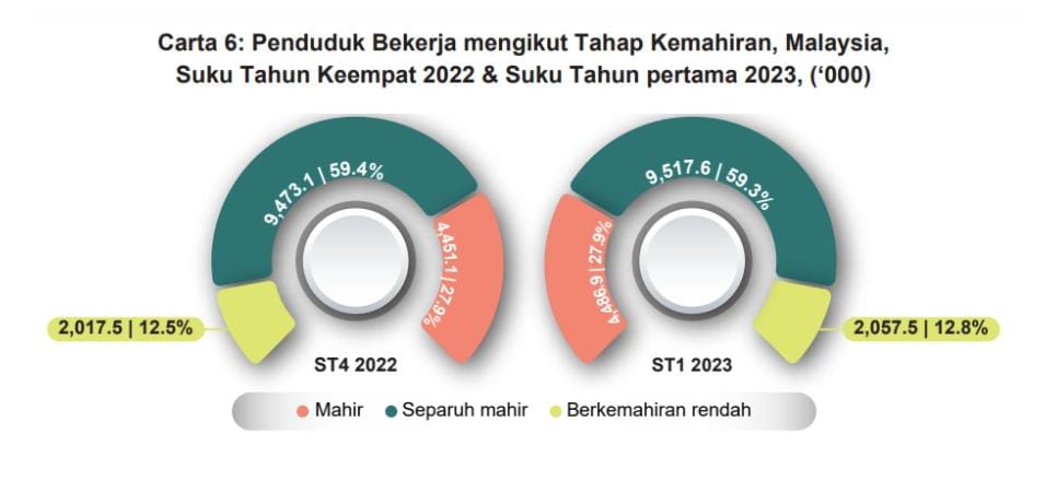 9. Tambahan lagi, laporan berkenaan juga menunjukkan bahawa majoriti (72.1%, 11.58 juta orang) penduduk Malaysia yang bekerja adalah pekerja separuh mahir dan berkemahiran rendah.