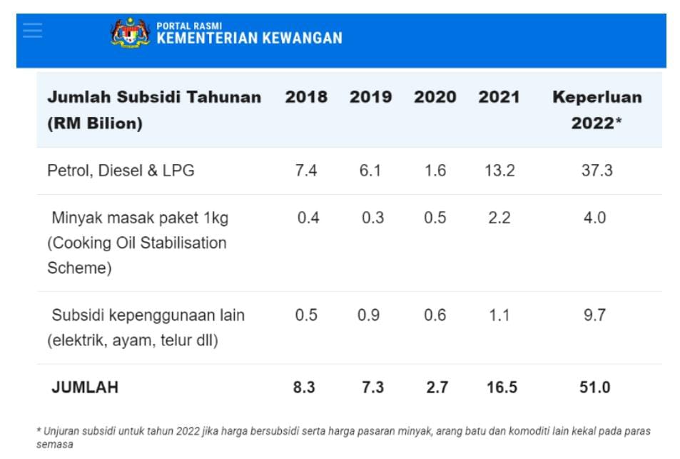 14. Kerajaan Malaysia telah lama melaksanakan kawalan harga ke atas beberapa barangan keperluan rakyat seperti minyak masak, ayam, telur dan petrol. Pelaksanaan kawalan harga ini melibatkan perbelanjaan subsidi tahunan yang amat besar. Dalam tempoh lima tahun (2018 – 2022), jumlah subsidi yang di belanjakan oleh Kerajaan Malaysia telah meningkat sebanyak 514% (RM 42.7 billion), dari RM 8.3 billion kepada RM 51 billion.