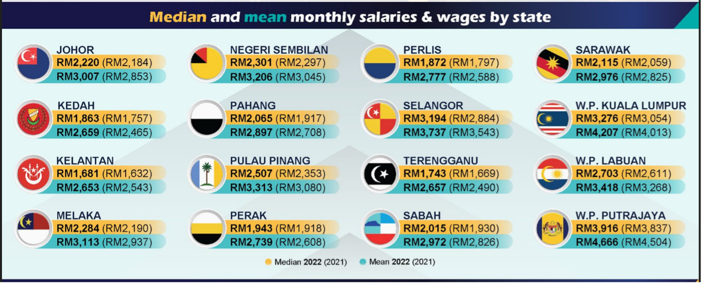 - Purata Gaji dan Upah Bulanan di Malaysia adalah RM 3,212, meningkat sebanyak 5.8% berbanding RM3,037 (2021)