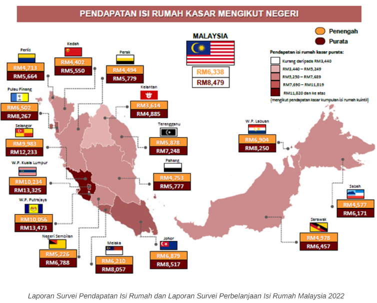 6. Pada akhir Julai 2023, Jabatan Perangkaan Malaysia (DOSM) telah mengumumkan laporan Survei Pendapatan dan Perbelanjaan Isi Rumah 2022. Menurut laporan tersebut, pendapatan isi rumah penengah Malaysia telah meningkat kepada RM 6,338 sebulan. Manakala, pendapatan isi rumah purata Malaysia pula telah meningkat kepada RM 8,479 sebulan.