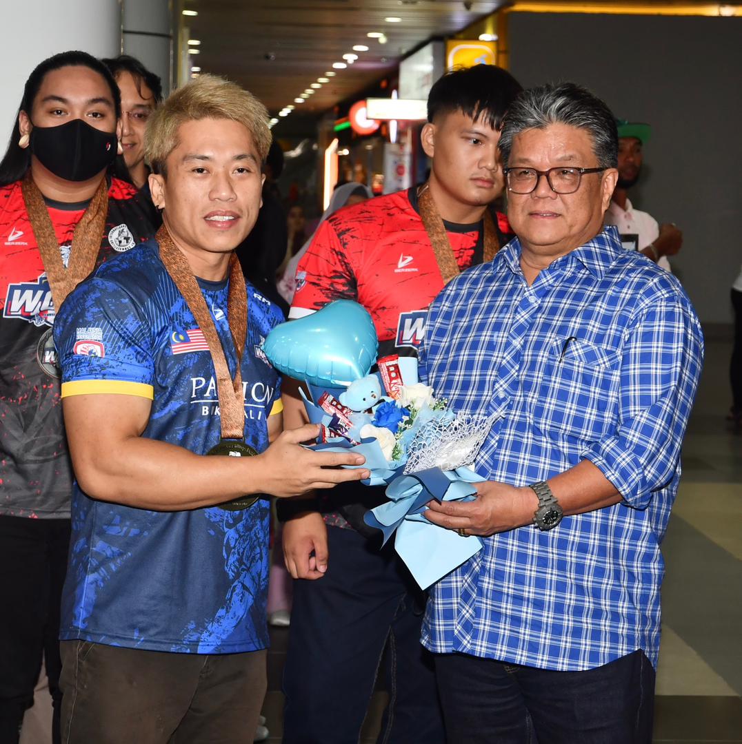 Kota Kinabalu : Empat anak jati Sabah yang berjaya menjadi juara pada Kejohanan Gusti Lengan Dunia 2023 menerima sambutan kepulangan di Lapangan Terbang Antarabangsa Kota Kinabalu (KKIA) di sini semalam.