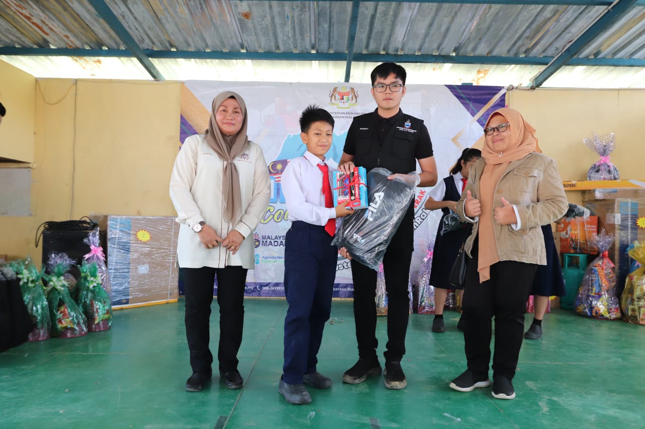 Setiap murid akan mendapat satu set barangan peralatan sekolah iaitu beg sekolah, buku dan alat-tulis.