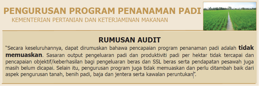 3.        Beberapa hari lepas, Laporan Ketua Audit Negara 2022 (LKAN 2022) telah melaporkan mengenai pengurusan program penanaman padi negara adalah tidak memeranjatkan, malah mengesahkan status industri padi masa kini. LKAN 2022 telah menonjolkan kepincangan pengurusan, kegagalan pencapaian sasaran serta tahap rendah pendapatan pesawah. Secara ringkasnya, LKAN 2022 merumuskan bahawa pencapaian program penanaman padi adalah tidak memuaskan.