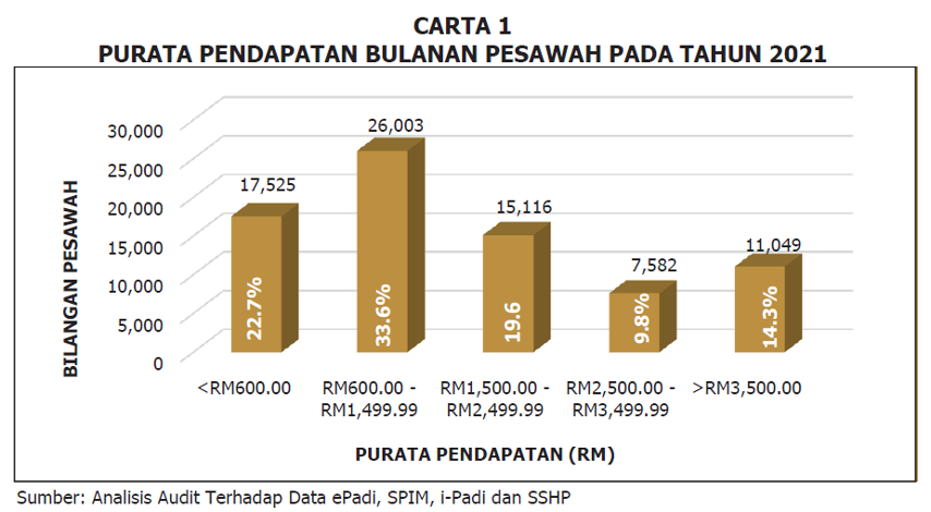 15.      Kegagalan pengurusan program penanaman padi telah menyumbang kepada prestasi serta pencapaian industri padi yang masih kekal rendah. Ini telah menyebabkan majoriti pesawah terus di belenggu kemiskinan. LKAN 2022 telah menganalisa data 77,275 (33.7%) pesawah daripada jumlah keseluruhan 229,322 pesawah yang mempunyai data lengkap di dalam sistem ePadi, i-Padi dan SPIM.