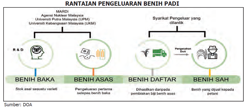- Syarikat pengeluar benih padi sah pula akan menggunakan benih padi daftar tersebut untuk menghasilkan dan membekalkan benih padi sah kepada petani, dengan menepati prosedur Skim Pengesahan Benih Padi dan Standard Jabatan Pertanian Malaysia (SJPM – 2009)