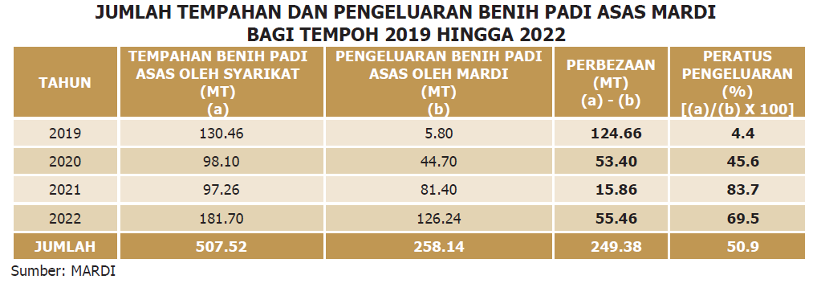 12. LKAN 2022 mendapati bahawa MARDI tidak dapat memenuhi tempahan bekalan benih padi asas yang di buat oleh 12 syarikat pengeluar benih padi sah. Untuk tempoh tahun 2019 – 2022, MARDI hanya mampu menghasilkan sejumlah 258.14 MT (50.9%) benih padi asas,berbanding jumlah tempahan 507.52 MT oleh 12 syarikat pengeluar benih padi sah.