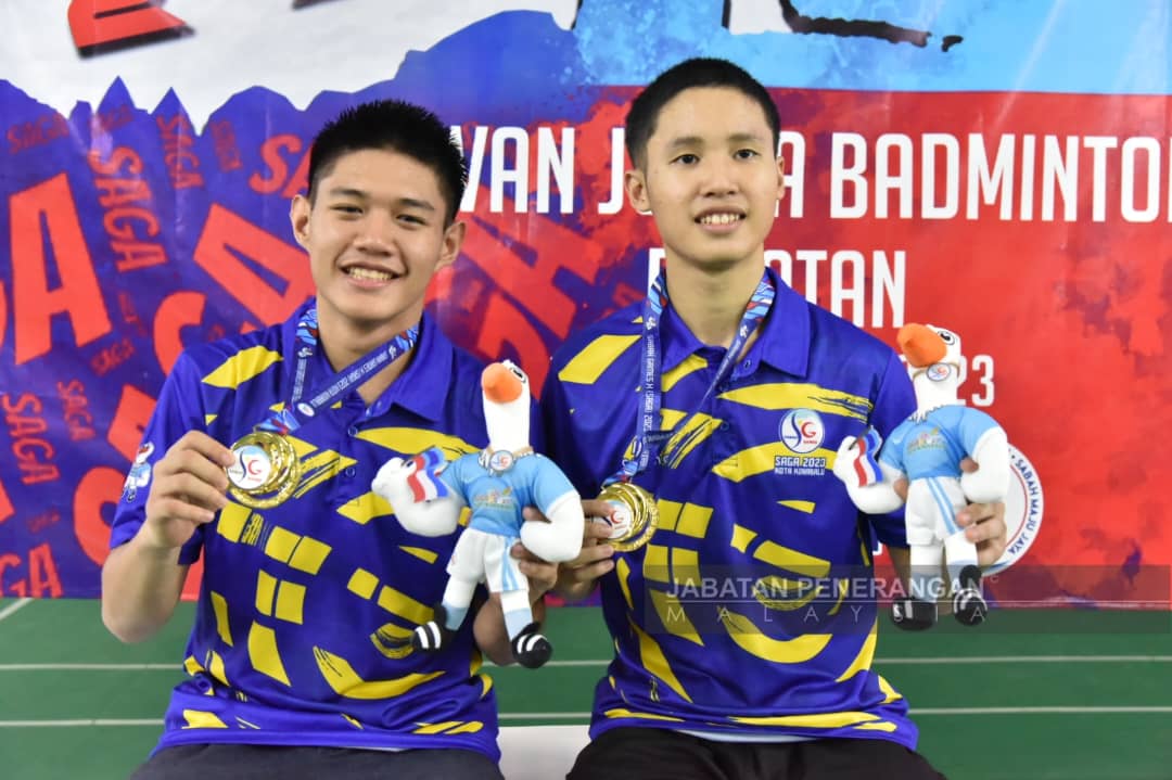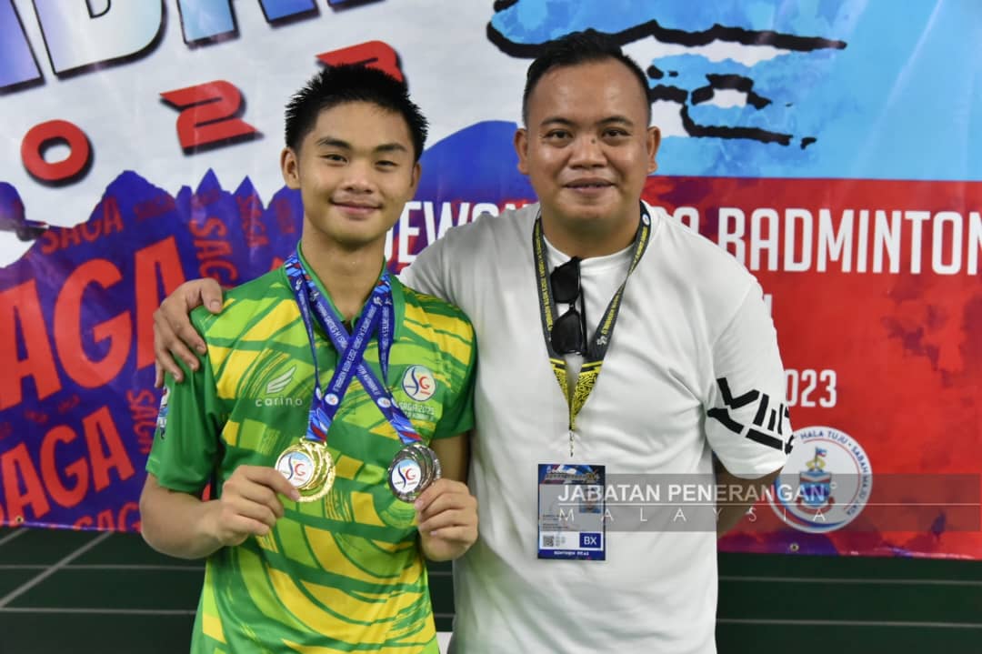 Muhammad Nur Azhar (kiri) dengan pingat emas (perseorangan lelaki) dan perak (beregu lelaki) diiringi oleh Pengurus Pasukan Badminton Pitas, Azroy Ruddy (kanan).