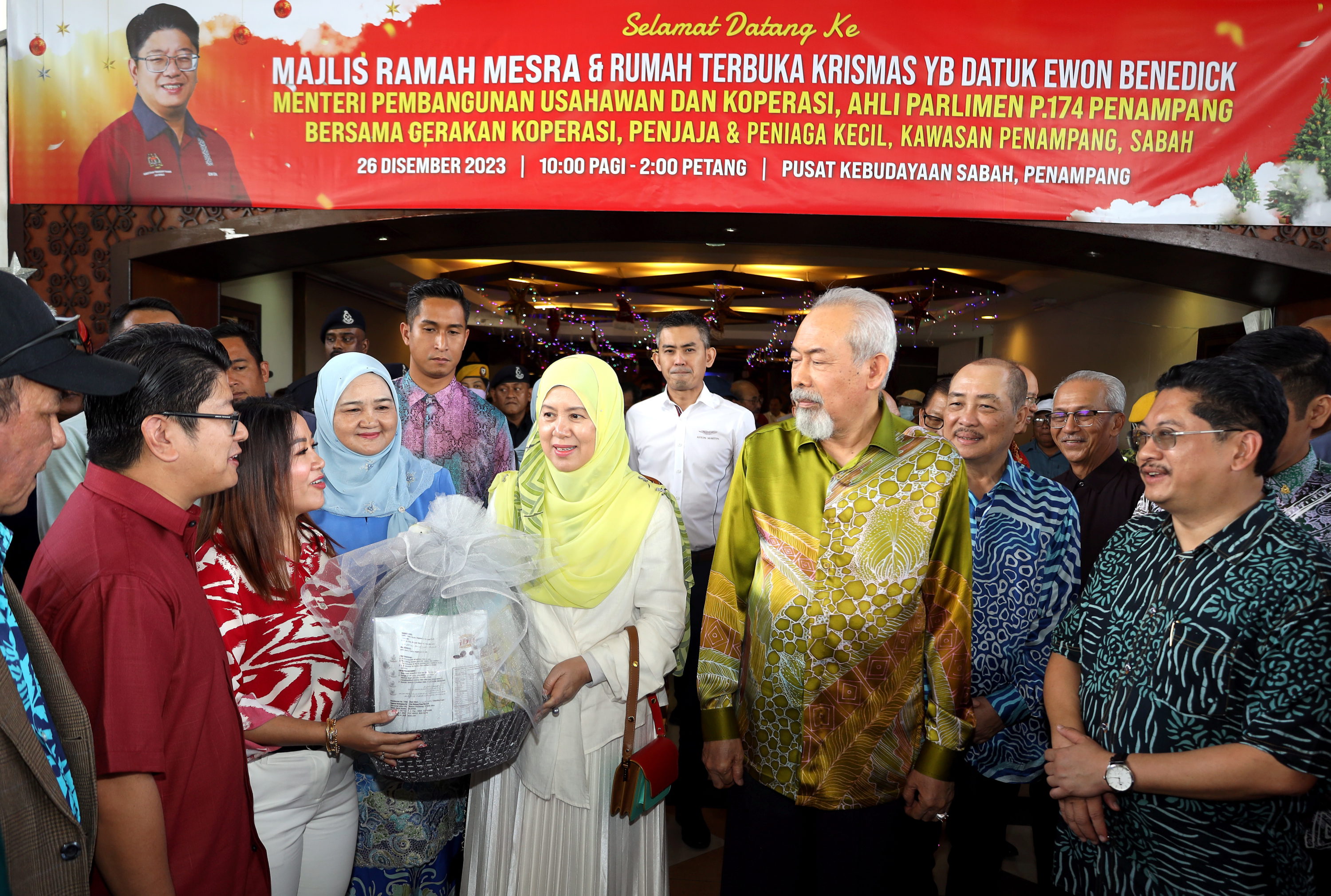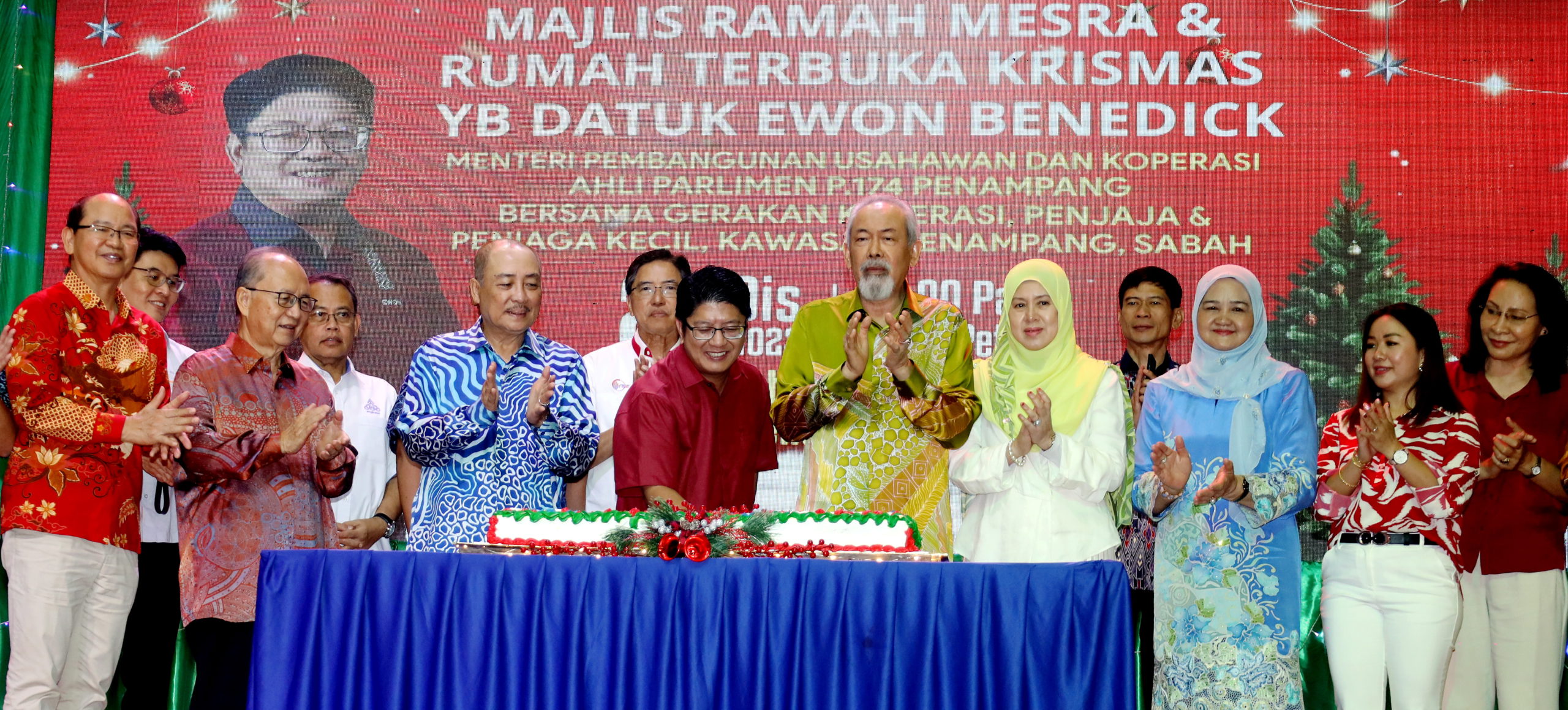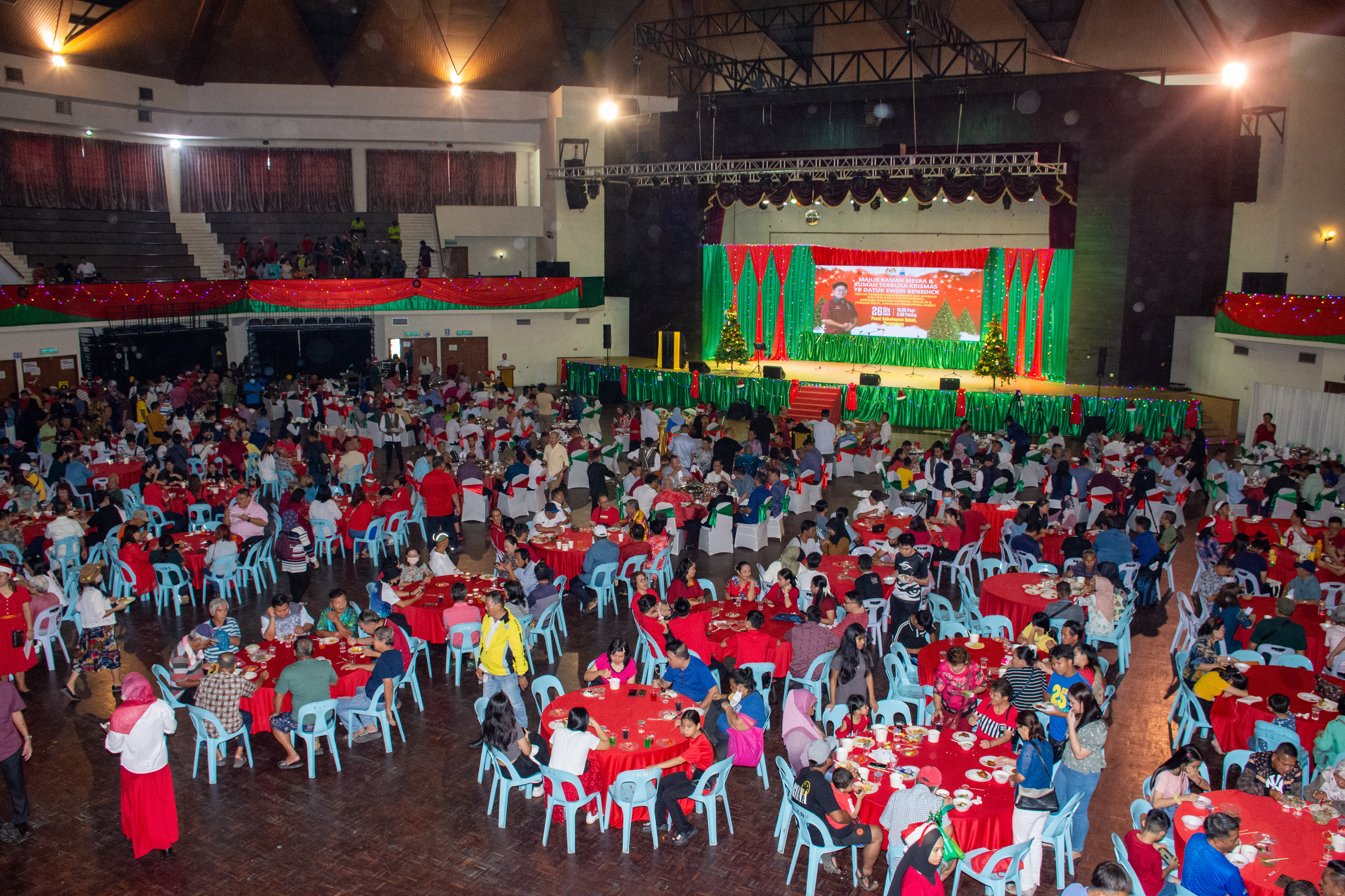 Penampang : Lebih 5,000 tetamu terdiri daripada masyarakat pelbagai etnik di daerah ini dan kawasan berhampiran hadir memeriahkan Majlis Ramah Mesra dan Rumah Terbuka Krismas Menteri Pembangunan Usahawan dan Koperasi Datuk Ewon Benedick.