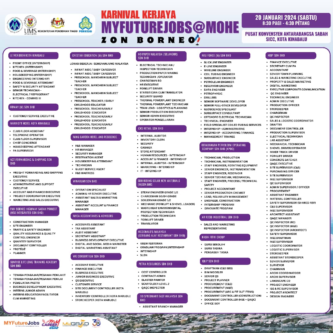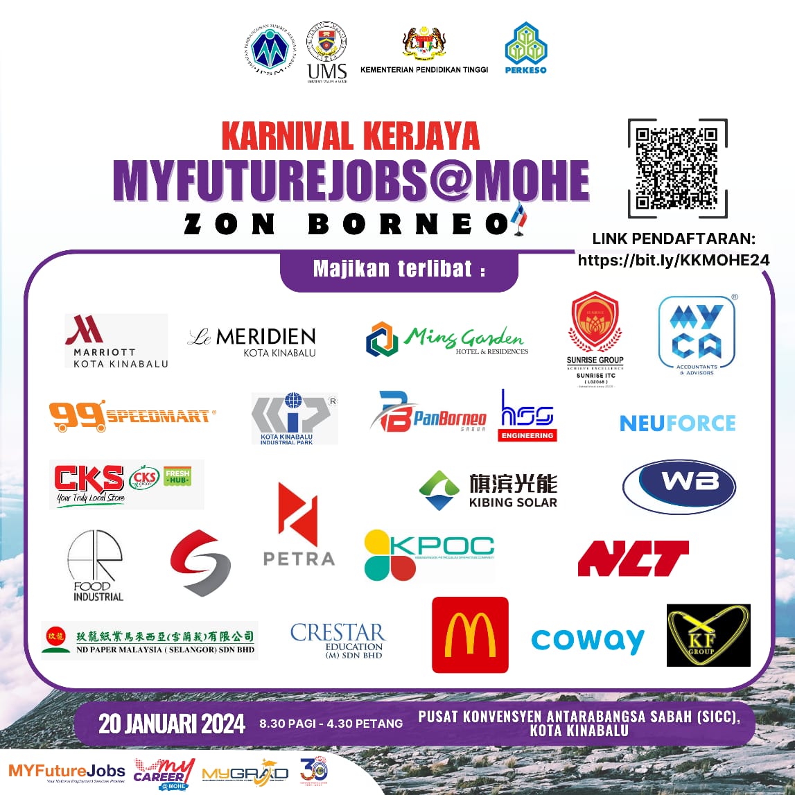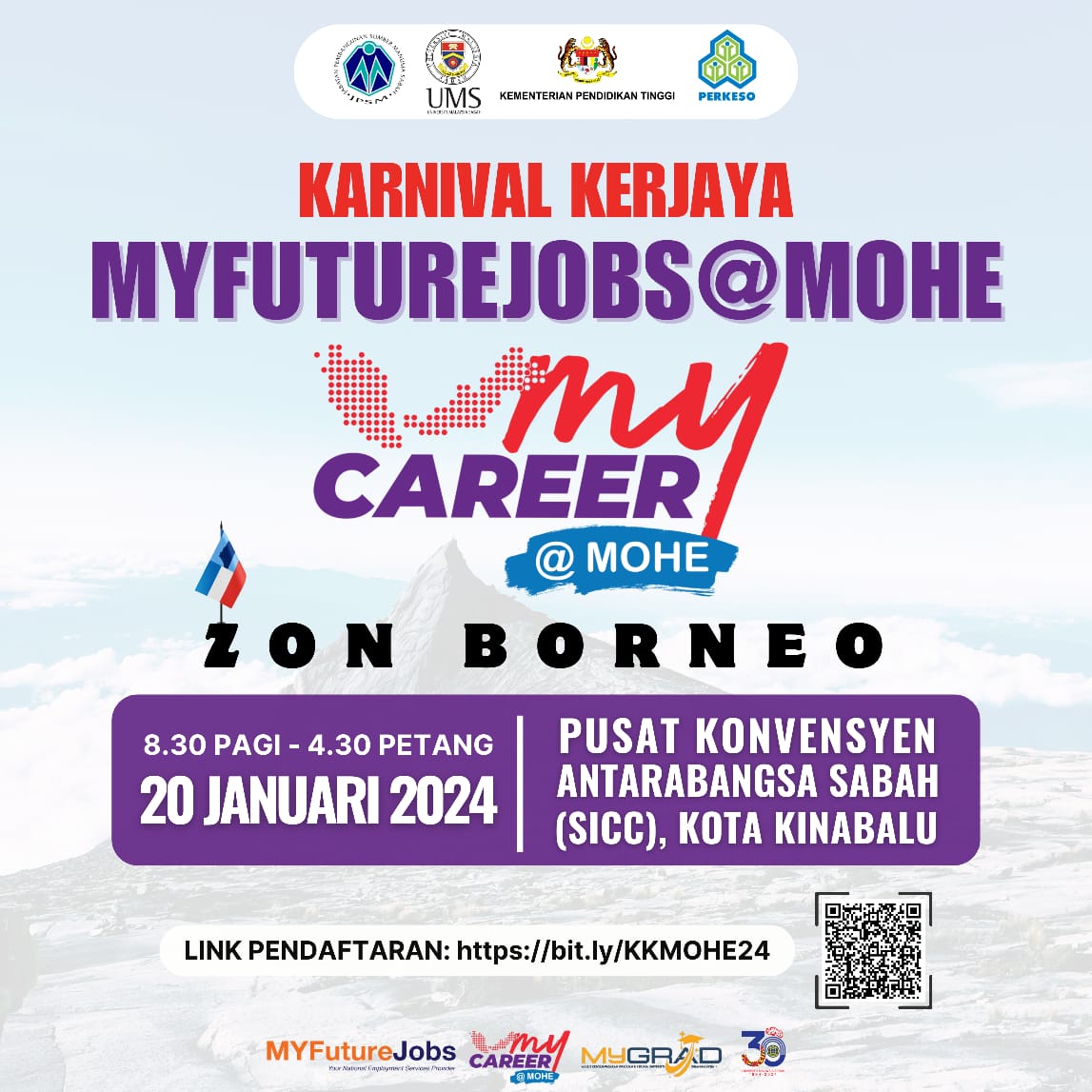 Kota Kinabalu : Orang ramai dipelawa untuk hadir memeriahkan Karnival Kerjaya MyFutureJobs @ MOHE Zon Borneo 2024 yang akan diadakan pada Sabtu ini.