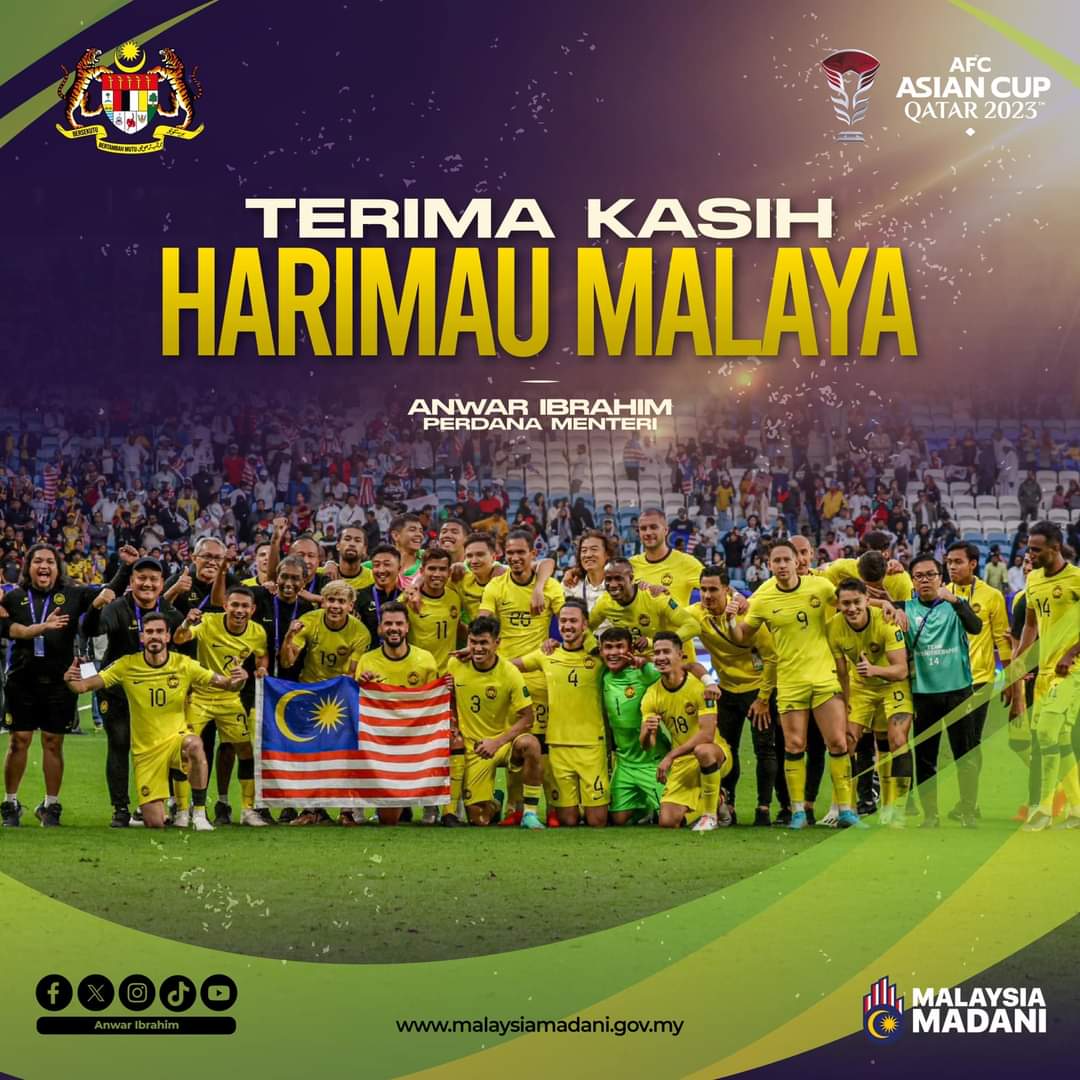 Kuala Lumpur: Perdana Menteri, Datuk Seri Anwar Ibrahim menzahirkan ucapan tahniah kepada pasukan Harimau Malaya yang berjaya memberikan tentangan sengit kepada Korea Selatan pada perlawanan terakhir Kumpulan E saingan Piala Asia 2023 di Stadium Al Janoub, Doha, Qatar, semalam.