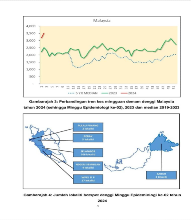 Pada 24 Januari 2024, hari Rabu lepas, kes meningkat sejumlah 15 kes sehari. Pada 23 Januari 2024, jumlah kes denggi harian adalah sejumlah 18 kes, manakala pada 22 Januari 2024 adalah sejumlah 26 kes harian. Berbanding pada awal Januari iaitu 14 kes harian pada 2 Januari 2024.