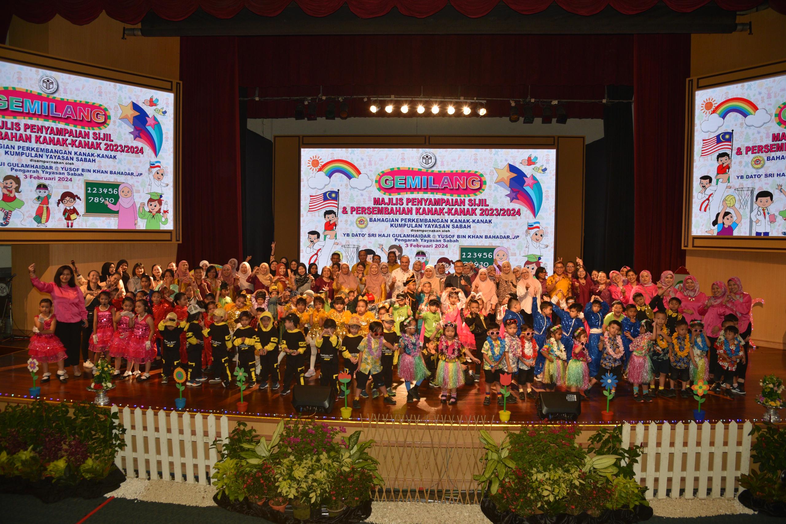 Kota Kinabalu : Seramai 77 orang kanak-kanak dari tiga buah tadika dibawah kendalian Kumpulan Yayasan Sabah (KYS) diraikan pada Majlis Penyampaian Sijil Prasekolah dan Persembahan Kanak-Kanak di sini semalam.