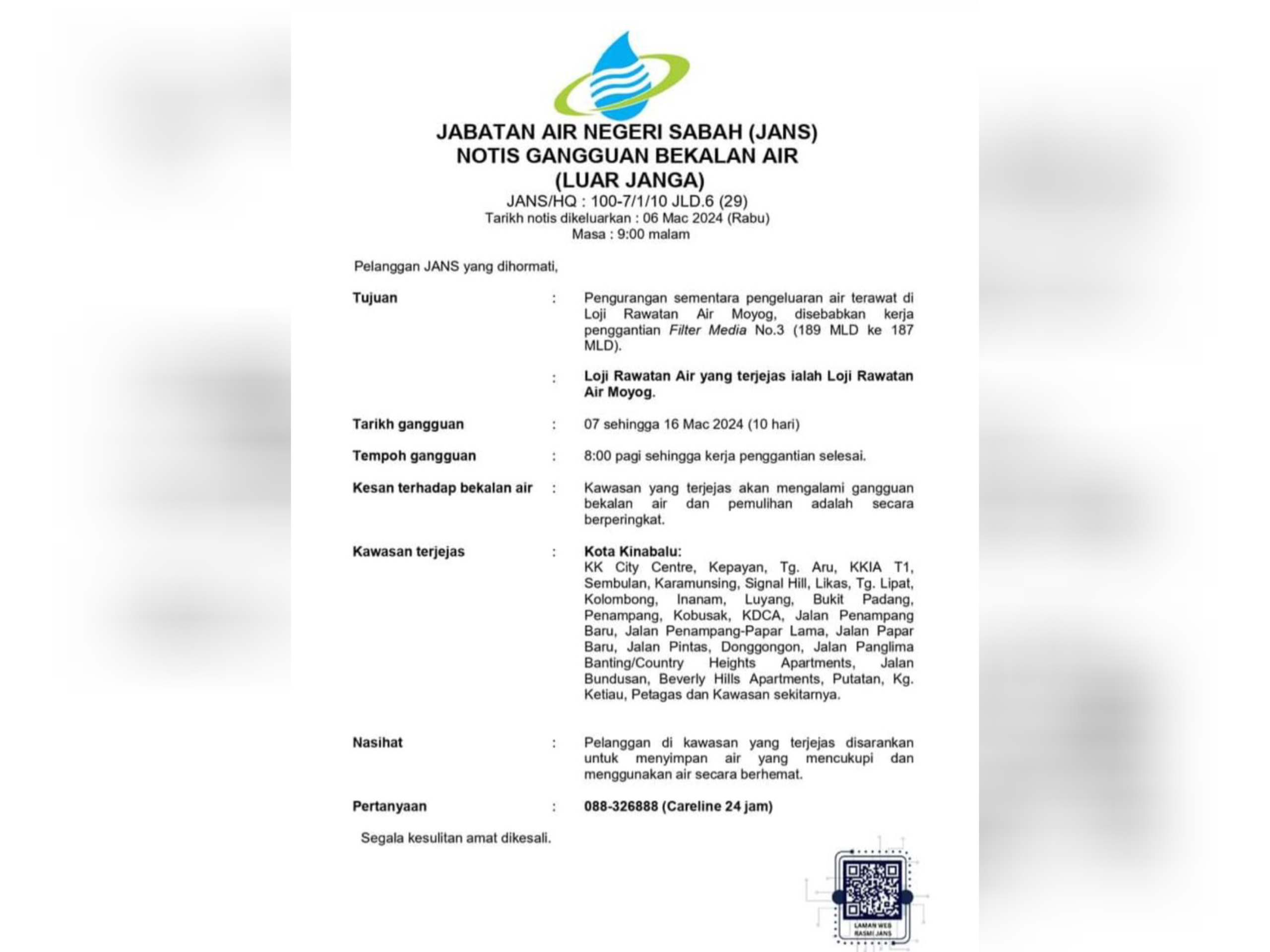 PAPAR: Jabatan Air Negeri Sabah (JANS) diminta menarik balik notis yang dikeluarkan semalam berkenaan 10 hari gangguan bekalan air di kawasan sekitar daerah Kota Kinabalu.