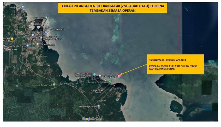 Pengarah Zon Maritim Lahad Datu, Komander Maritim Ts. Dr. Suzanna Razali Chan berkata, berdasarkan laporan awal, seramai tiga orang suspek bersenjatakan pistol telah melepaskan empat das tembakan ke arah Bot Banggi 48.