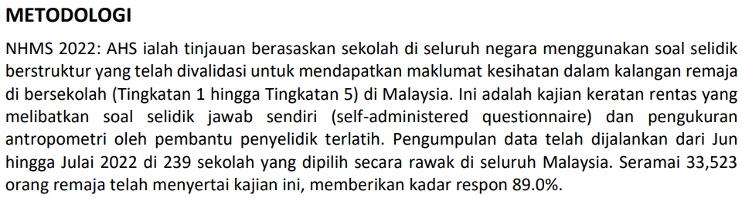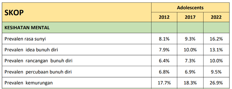 10. Di samping itu, Tinjauan Kesihatan & Morbiditi Kebangsaan/ National Health & Morbidity Survey (NHMS) 2022 oleh Kementerian Kesihatan Malaysia, juga menunjukkan trend peningkatan isu kesihatan mental di kalangan remaja negara, termasuklah berkaitan bunuh diri.