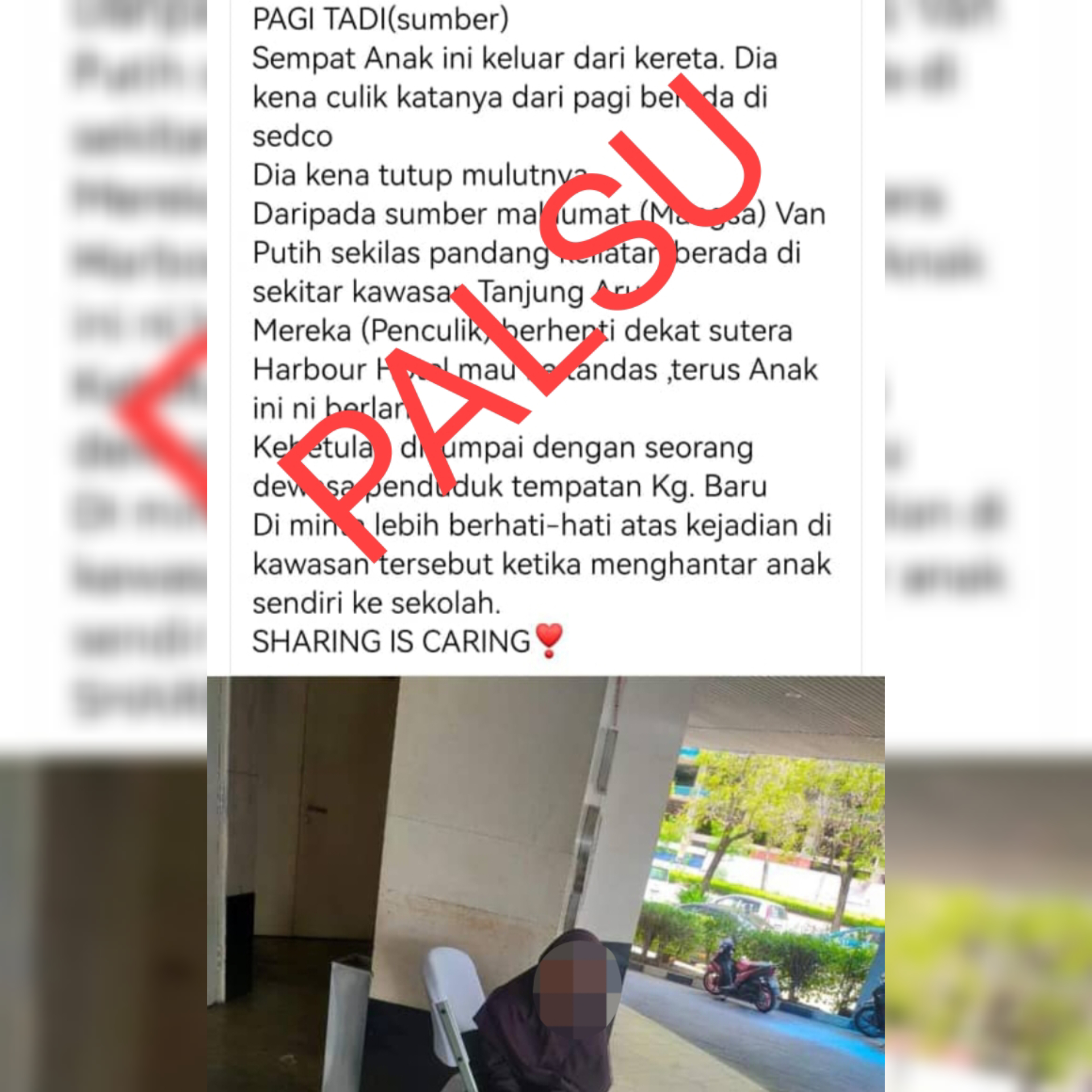 KOTA KINABALU: Tular di media sosial dakwaan seorang remaja perempuan kononnya menjadi mangsa culik sebelum berjaya menyelamatkan diri di Daerah Kota Kinabalu hari ini, adalah palsu dan rekaan semata-mata.