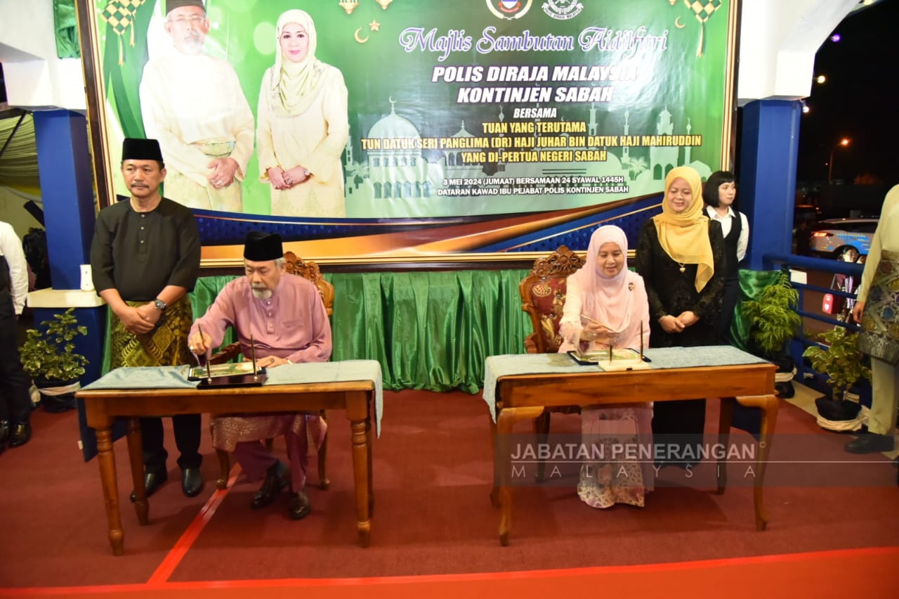 Kota Kinabalu: Yang di-Pertua Negeri Sabah Tun Juhar Mahiruddin dan isteri, Toh Puan Norlidah R.M Jasni menghadiri Majlis Rumah Terbuka Aidilfitri Polis Diraja Malaysia (PDRM) Kontinjen Sabah, di sini malam tadi.