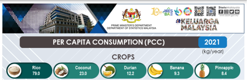 21.      Beras merupakan makanan utama rakyat Malaysia. Menurut data Jabatan Perangkaan Malaysia (DOSM) 2021, secara purata, seorang rakyat Malaysia makan beras atau nasi sebanyak 79 kg setahun.