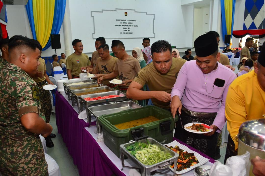 Selesai proses melapah, Panglima 5 Divisyen turut bersama dalam jamuan Hari Raya Aidiladha seterusnya mengagihkan daging korban kepada warga 5 Divisyen Kem Lok Kawi bertempat di Dewan Kinabalu.