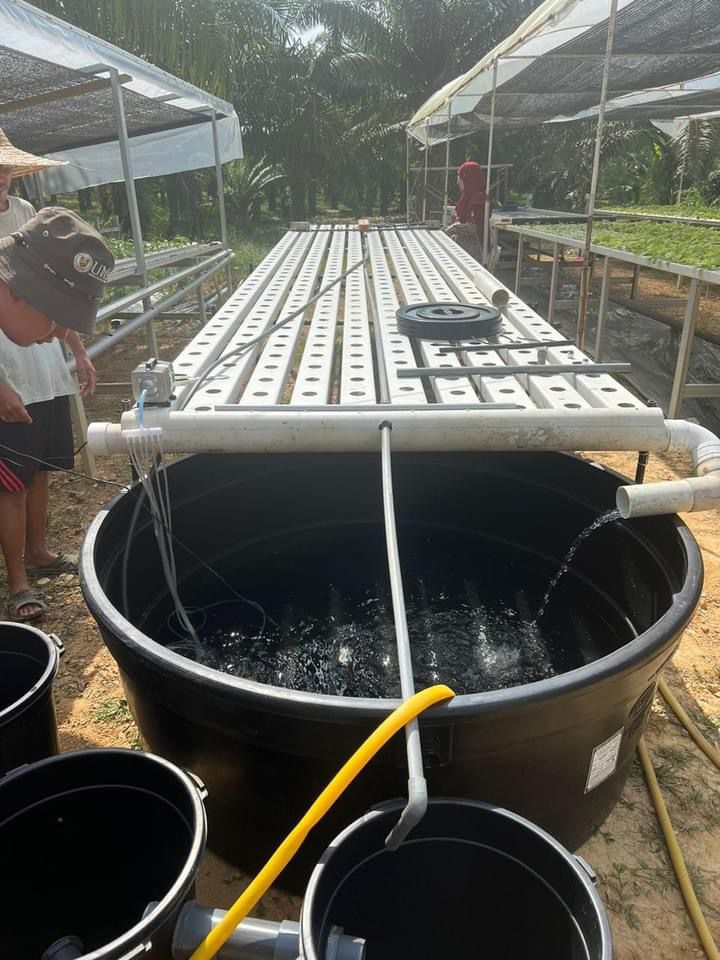 “Tahap ketiga dan keempat pula adalah proses pemindahan ilmu dan penerapan teknologi di lokasi projek membangun komuniti usahawan tani di Sandakan, Sabah, yang antara lain berkaitan pemasangan peralatan akuaponik dan penjelasan mengenai mekanisme kerja sistem akuaponik.