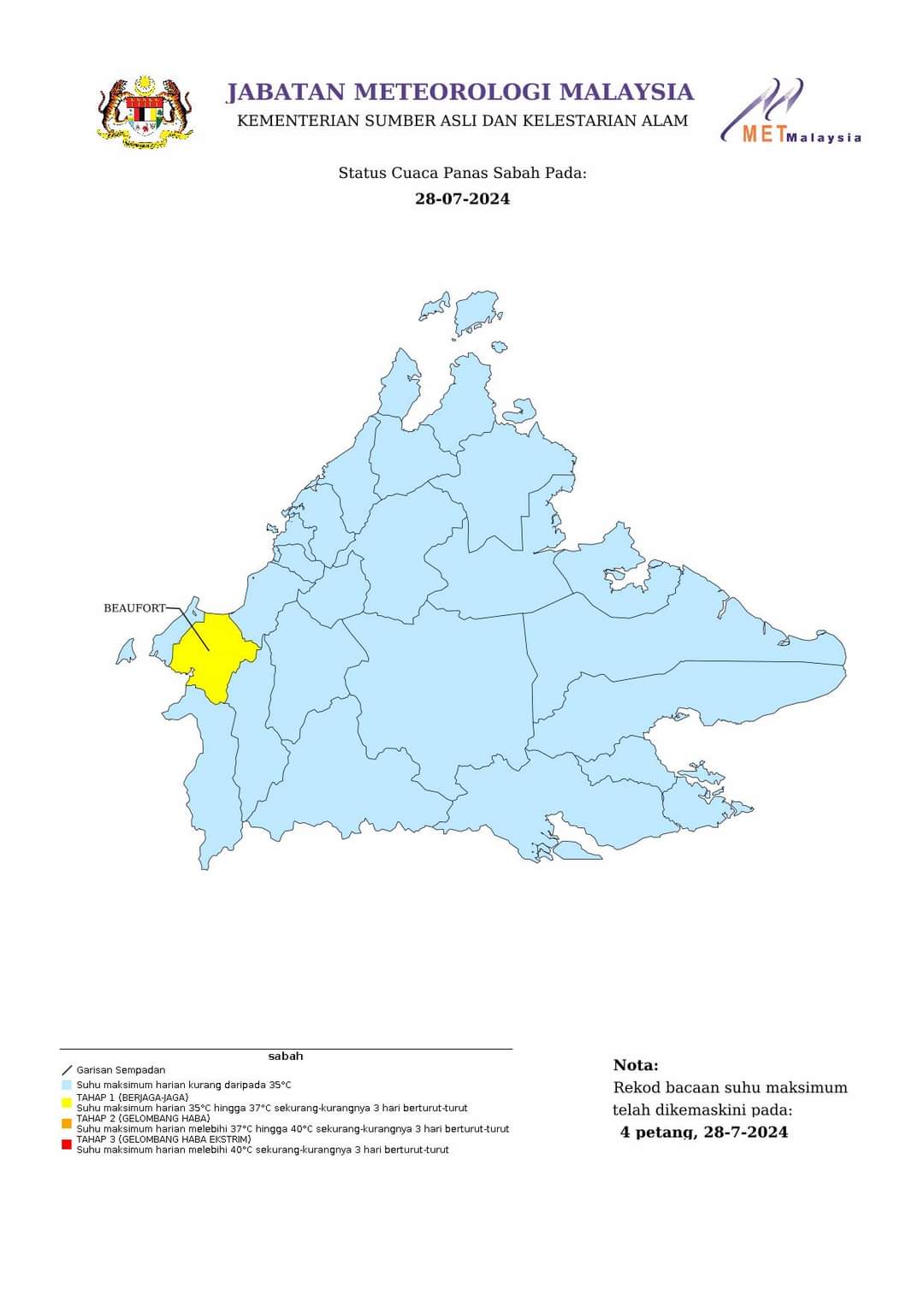 Kota Kinabalu : Beaufort menjadi kawasan di Sabah yang dilaporkan mengalami cuaca panas tahap berjaga-jaga yang boleh mencecah suhu sehingga 37 darjah celcius.