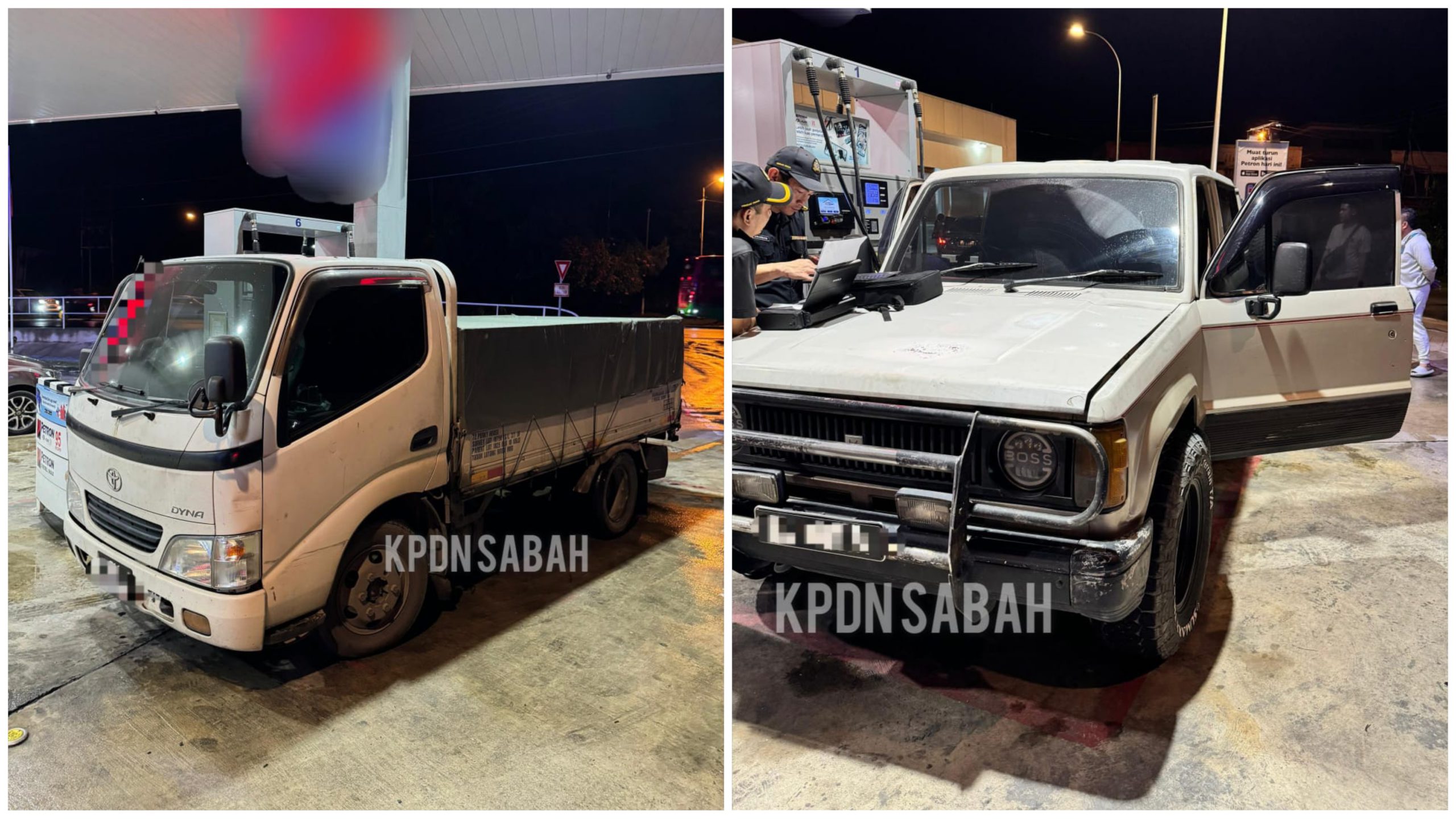 Operasi yang dijalankan sepasukan pegawai penguat kuasa dari Ibu Pejabat KPDN Sabah sekitar jam 9.10 malam semalam itu turut menahan dua buah kenderaan iaitu sebuah pacuan empat roda jenama Isuzu Trooper dan sebuah lori jenama Toyota Dyna.