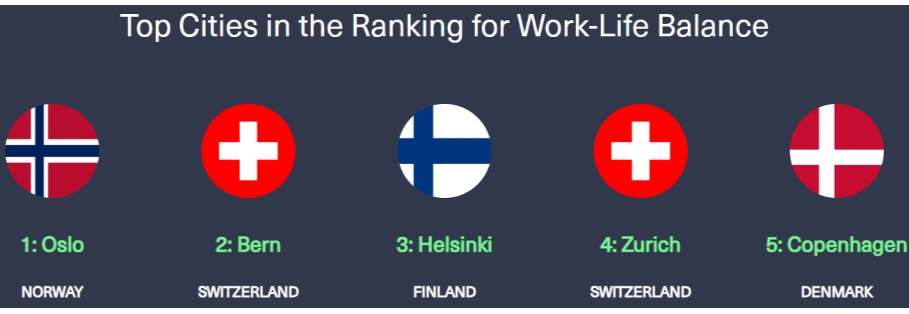 25. Malah, menurut laporan oleh KISI, bandar-bandar di negara ekonomi barat yang merekodkan jumlah jam bekerja yang rendah dan mencapai daya-saing yang tinggi, turut menyediakan work-life balance yang terbaik di dunia.