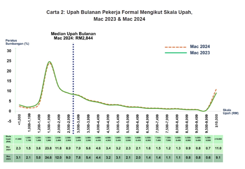 18. Menurut laporan Statistik Upah Pekerja Suku Tahun Pertama 2024 oleh Jabatan Perangkaan Malaysia (DOSM), Median Upah Bulanan pekerja di Malaysia adalah RM 2,844 sebulan.
