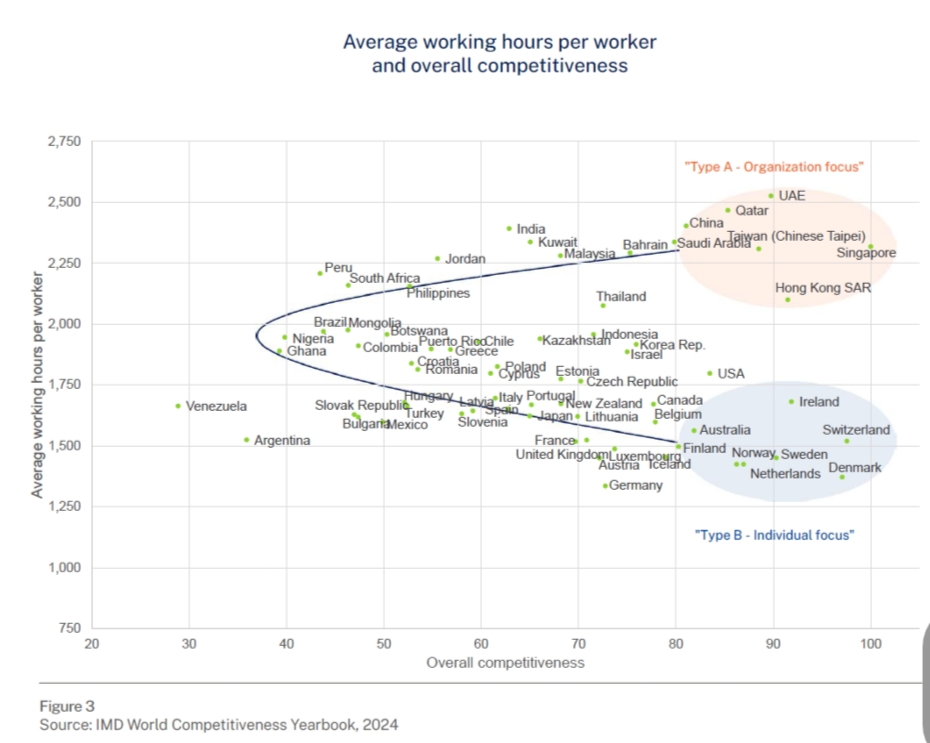 11. Di samping itu, lebih menarik WCR 2024 turut menunjukkan hubung-kait pencapaian daya-saing negara berbanding jumlah jam bekerja, di mana ianya meletakkan negara-negara di dalam dua kelompok yang berbeza.