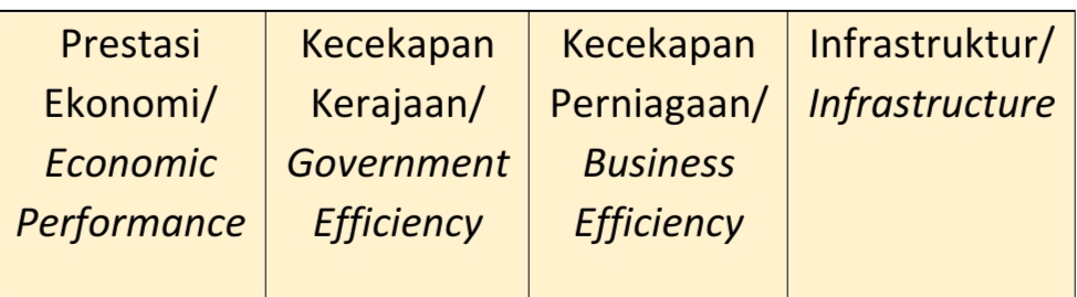 6. Laporan World Competitiveness Ranking 2024 (WCR 2024) telah meletakkan Malaysia di tangga ke-34, daripada 67 buah negara yang di nilai. Di bawah WCR 2023, Malaysia berada di kedudukan ke-27. Ranking WCR 2024 tersebut di buat berdasarkan 4 faktor penilaian: