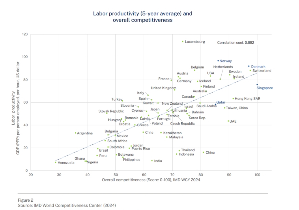 8. Antara lain, laporan WCR 2024 telah melihat kepada hubungan-kait/ correlation di antara produktiviti pekerja dan daya saing negara. WCR 2024 merumuskan bahawa terdapat hubung-kait yang tinggi/ positive correlation, di mana peningkatan nilai produktiviti pekerja meletakkan daya saing negara berkenaan di kedudukan yang tinggi.