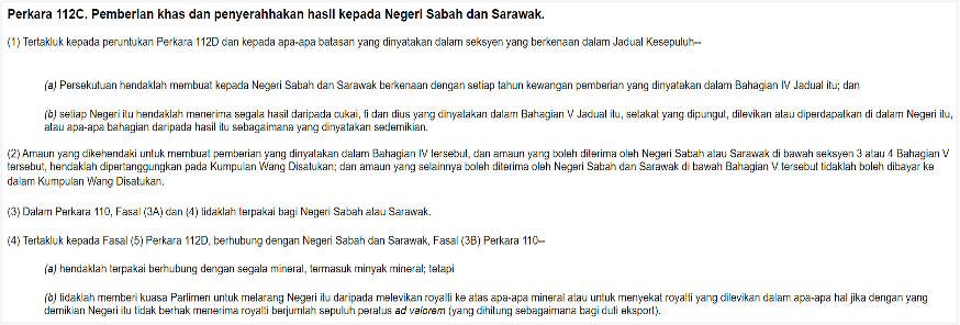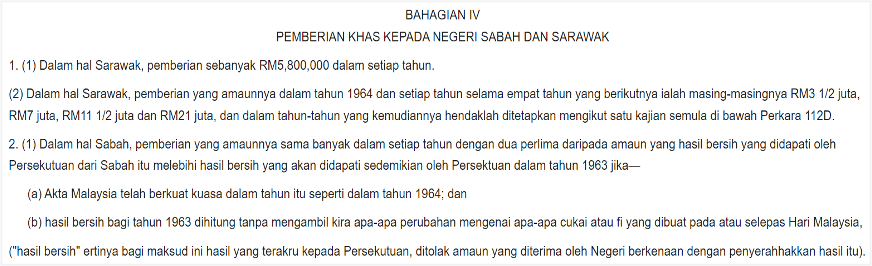 4. Sebagaimana termaktub di bawah Perlembagaan Persekutuan, Sabah berhak menerima Geran Khas Tahunan daripada Kerajaan Malaysia, sebanyak dua-perlima (40%) daripada kutipan hasil yang di perolehi oleh Kerajaan Malaysia dari Sabah.