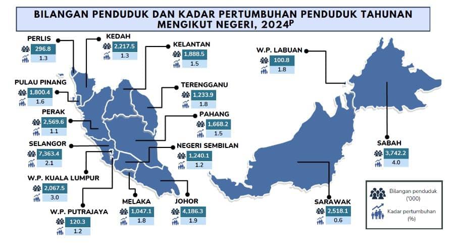 1. Pada penghujung bulan Julai 2024, Jabatan Perangkaan Malaysia (DOSM) telah menerbitkan Laporan Anggaran Penduduk Semasa Malaysia 2024. Antara lain, laporan tersebut memaparkan trend dan keadaan penduduk semasa bagi negeri dan wilayah seluruh negara.