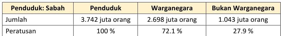 4. Daripada jumlah penduduk seramai 3.742 juta orang tersebut, Sabah memiliki jumlah penduduk bukan warganegara yang mencecah 28%.
