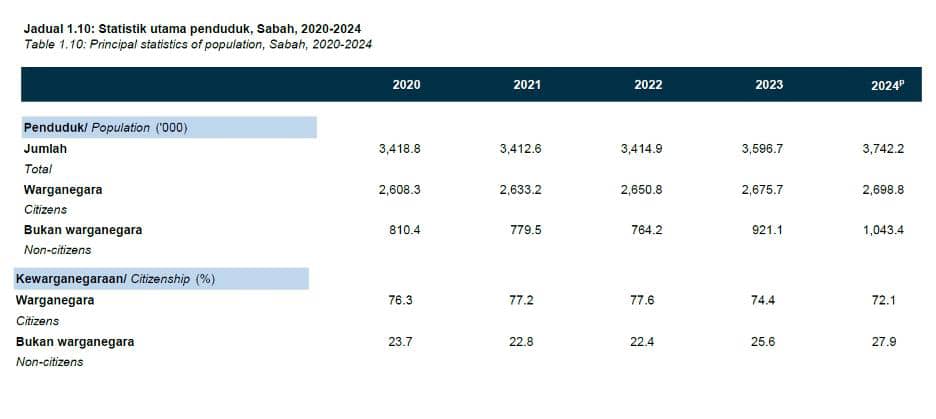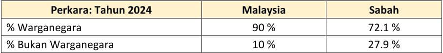 26. Laporan Anggaran Penduduk Semasa Malaysia 2024 berkenaan jelas menunjukkan demografi penduduk Sabah telah berubah dengan ketara, di mana jumlah dan peratusan penduduk bukan warganegara telah meningkat dengan mendadak.