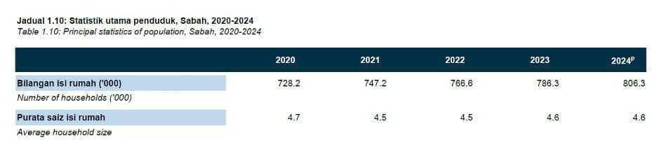 16. Pada masa yang sama, dengan peningkatan penduduk yang tinggi, Sabah turut merekodkan peningkatan bilangan isi rumah/ number of households hampir 11%, meningkat dari 728.2 ribu (2020) kepada 806.3 ribu (2024).