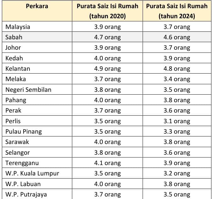 17. Manakala, purata saiz isi rumah/ average household size di Sabah adalah 4.6 orang, tanpa perubahan ketara. Namun begitu, purata saiz isi rumah di Sabah adalah lebih tinggi berbanding purata nasional (3.7 orang), dan ke-2 tertinggi selepas Kelantan (4.8 orang).