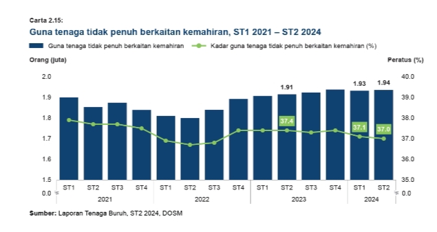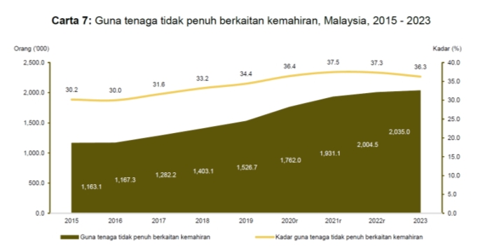 - jumlah guna tenaga tidak penuh berkaitan kemahiran telah mencatatkan peningkatan ketara sebanyak 75% (0.8719 juta orang), iaitu dari 1.1631 juta (2015) kepada 2.035 juta (2023)