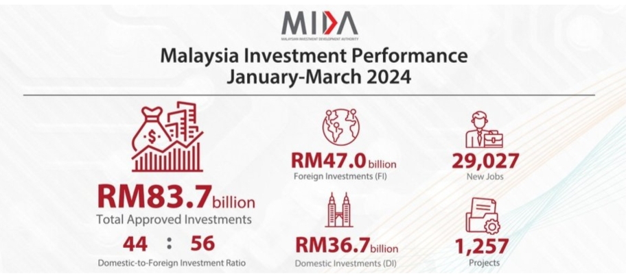 17. Pewujudan jawatan baru bergantung kepada jumlah pelaburan di dalam ekonomi negara, samada pelaburan domestik ataupun asing. Menurut laporan Malaysia Investment Performance January – March 2024 oleh Malaysian Investment Development Authority (MIDA), jumlah pelaburan yang di luluskan/ total approved investment berjumlah RM 83.7 billion, melibatkan 1,257 projek.